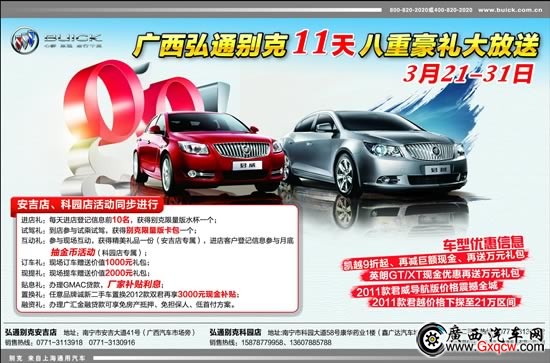 (廣西汽車網(wǎng)訊)3月21日-31日廣西弘通別克隆重推出南寧三家店同步進行,活動期間八重豪禮大放送,讓您空手而來滿載而歸,別猶豫了,趕緊來參加吧!