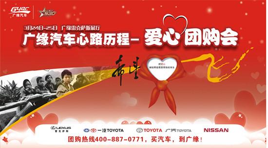 廣緣汽車攜手930私家車電臺(tái)《關(guān)愛聯(lián)盟》邀您一起做公益,為百色市隆林縣豬場(chǎng)鄉(xiāng)爛木干小學(xué)的孩子送去學(xué)習(xí)的希望。3月24日-25日到高新區(qū)科園大道45號(hào)雷克薩斯展廳參加廣緣汽車愛心團(tuán)購(gòu)會(huì),購(gòu)買雷克薩斯、一汽豐田、廣汽豐田、東風(fēng)日產(chǎn)車型即以您的名義為山里的孩子送去愛心,更能直享團(tuán)購(gòu)價(jià)!最高可獲贈(zèng)10萬公里汽油,更大優(yōu)惠、更大的驚喜!