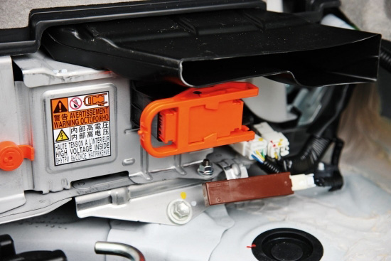 大塊的鎳氫充電電池被“埋伏”在后備廂下,掀開蓋板就可一見崢嶸。