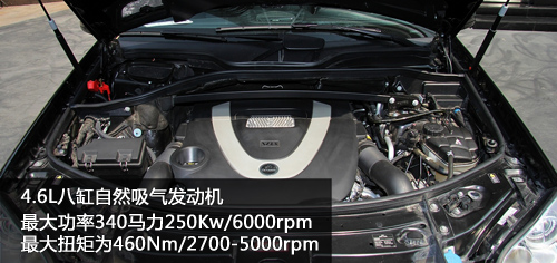 CGL45與奔馳GL450一樣,搭載了一臺8缸4.6L自然吸氣發(fā)動機,最大功率340馬力(250Kw/6000rpm),最大扭矩為460Nm(2700-5000rpm)。雖然乍看動力指標(biāo)強悍,但別忘了車身重量在2.3噸以上的全尺寸SUV慣性很大,加速和剎車都是考驗。