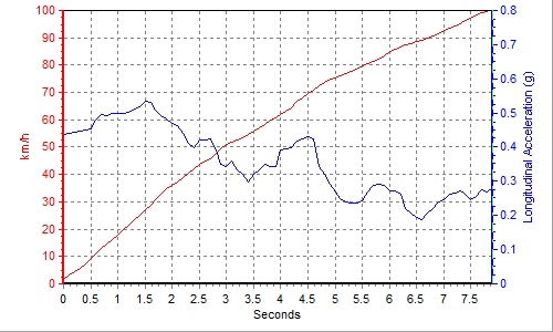 通過換擋撥片可以讓7AT變速器進入激進模式,從圖上來看,換檔的動作非常迅速,動力的銜接很好,并且在這個過程中幾乎沒有速度的衰減,整個加速過程非常線性,對于一輛2.3噸重的SUV,7.8秒的已經(jīng)算的上是比較出色的加速成績。