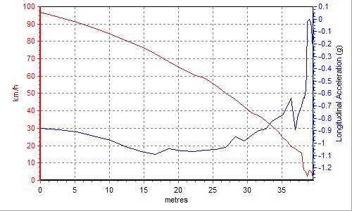 將懸掛調(diào)節(jié)到Sport運動模式后,它能對車身提供更好的支撐效果,此時來測試車輛的剎車最合適。CGL45在制動初期減速度并不明顯,以至于40-0公里/小時的制動竟然用去了10米的距離,但隨后強大的制動力會馬上開始體現(xiàn),最高時,負(fù)值加速度接近-1.1G,制動因為路面和交通原因,沒有能進行熱衰退的測試,單次剎車距離,CGL45得到的距離為42.29米。