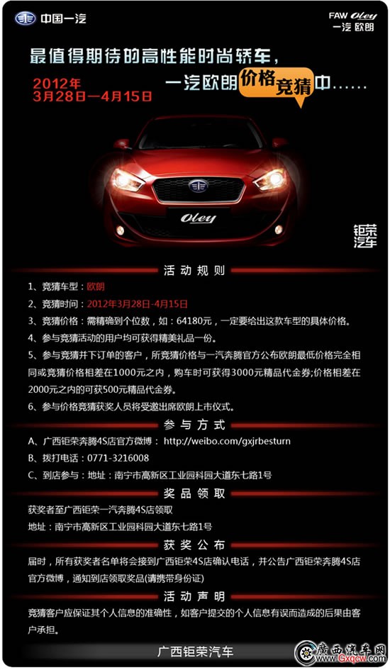 獲獎(jiǎng)?wù)咧翉V西鉅榮一汽奔騰4S店領(lǐng)取