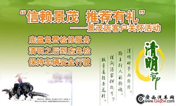 每到清明,一家出行,面對的是顛簸的鄉(xiāng)村小道,對車輛有著不小的考驗。景茂寶駿秉承“以客為尊,與您為伴”的服務(wù)理念,想您所想,做您所需,特別推出清明節(jié)關(guān)懷客戶活動。