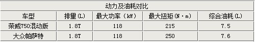 榮威750的混動(dòng)系統(tǒng)由一臺(tái)1.8L渦輪增壓發(fā)動(dòng)機(jī)與一臺(tái)峰值功率為20千瓦的電動(dòng)機(jī)組成,該系統(tǒng)配有自動(dòng)啟停系統(tǒng)、動(dòng)能回收系統(tǒng),并在起步、加速等情況下,為車輛提供額外的動(dòng)力,從而減少發(fā)動(dòng)機(jī)的燃油消耗。在對(duì)比中,由于750的渦輪增壓發(fā)動(dòng)機(jī)并未采用直噴技術(shù),所以在面對(duì)大眾帕薩特時(shí),榮威750混動(dòng)版車型的優(yōu)勢(shì)并未完全體現(xiàn)出來。