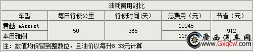 在輕混車型中,以購(gòu)買一輛君eAassist為例,在為其一年的時(shí)間以平均每天行駛50公里計(jì)算,在一年結(jié)束時(shí)君越eAssist的油耗花費(fèi)為10945元,而相同 排量的雅閣則在油費(fèi)上花費(fèi)了11857元,兩者相差912元。