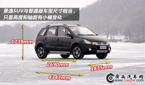 景逸SUV更像是一款跨界車型,該車長了一副普通版景逸的面孔,但身上的跨界套件則使其散發(fā)出一絲越野的氣息。車身尺寸方面,該車長寬高分別為4347/1835/1739mm,軸距2690mm。行走配置上,采用的是215/60 R17規(guī)格寬胎。