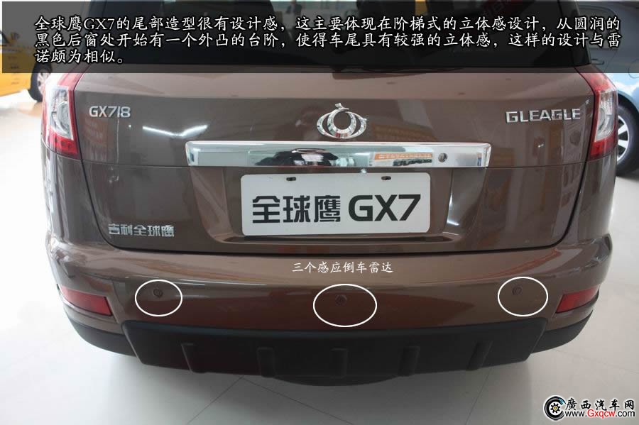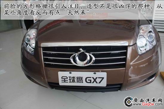 外觀造型來說,GX7以肌肉感十足的線條顯現(xiàn)出了歐美車的霸氣,這點在車頭造型中的多邊形前大燈、寸尺巨大的矩形進氣格柵、放大效果的全球鷹logo中表現(xiàn)比較明顯。