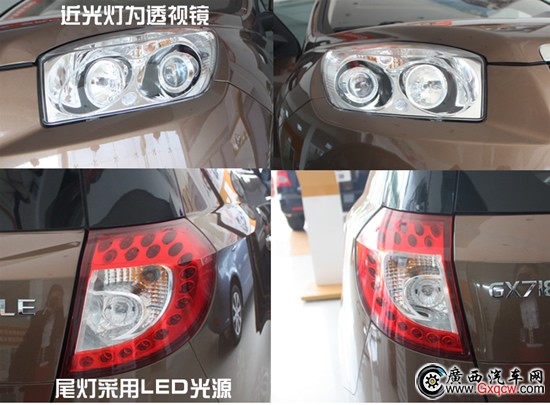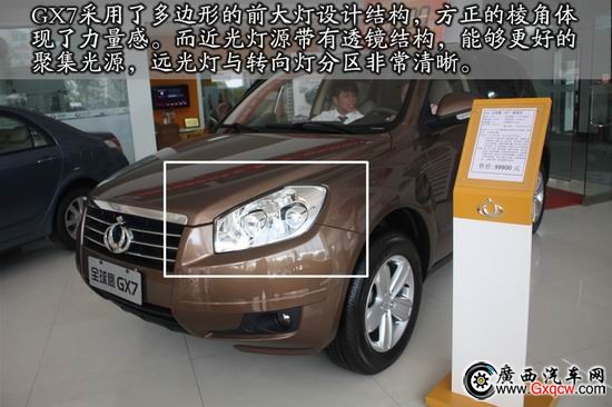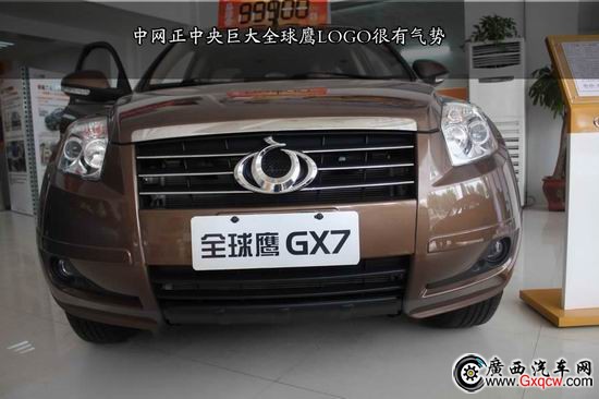 前臉采用了三段式鍍鉻進氣格柵設(shè)計,加上碩大無比的全球鷹logo,讓GX7顯得力量十足,同時GX7采用了晶鉆組合一體式大燈,并可調(diào)節(jié)燈光高度,高配車型還配備了光感自啟閉功能。