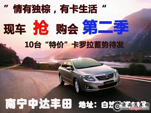 據(jù)悉,上周末白沙大道南寧中達(dá)豐田“情有獨(dú)棕,有卡生活”卡羅拉限量搶購會(huì)第一季的13臺(tái)“特價(jià)”卡羅拉反響熱烈、一搶而空, 4月2-3日,應(yīng)大眾要求“情有獨(dú)棕,有卡生活”搶購會(huì)第二季再次推出10臺(tái)“特惠”卡羅拉,“惠”動(dòng)全城~~~