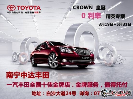 南寧中達(dá)豐田皇冠0利率精英專案現(xiàn)已啟動(dòng),即日起至5月31日前,三款0利率貸款方案任你選擇;完全無息,最低首付21000元起,CROWN皇冠即可讓您開回家。