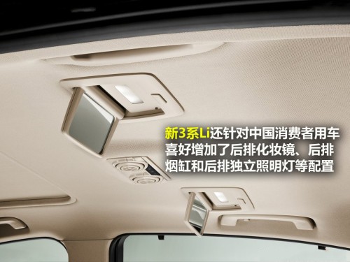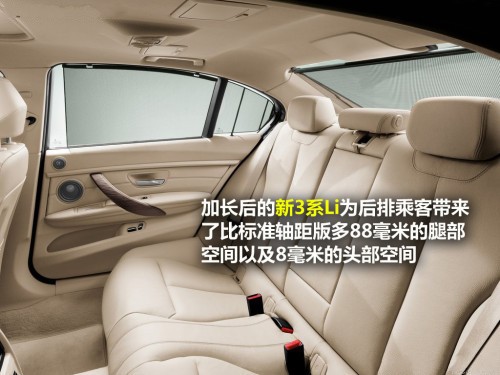 既然是加長版車型,新3系Li的后排空間表現(xiàn)自然是消費者最為關(guān)注的地方。從已知的數(shù)據(jù)可以了解到,加長后的新3系Li為后排乘客帶來了比標(biāo)準(zhǔn)軸距版多88毫米的腿部空間以及8毫米的頭部空間,提供給后排乘客一個更大、更舒適的乘坐空間。同時,新3系Li還針對中國消費者用車喜好增加了后排化妝鏡、后排煙缸和后排獨立照明燈等配置,支持40:20:40三段式比例放倒的后排座椅也可以用來滿足空間需求的多樣性和便利性。