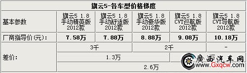 縱觀旗云5的5款車型,包括三款手動(dòng)車型和兩款自動(dòng)擋車型,從7.58萬(wàn)到10.18萬(wàn)元不等,對(duì)手鎖定為比亞迪G6、中華駿捷、帝豪EC8及江淮賓悅等自主中級(jí)車型。價(jià)格梯度比較明顯,價(jià)格跨度有2.6萬(wàn)元,入門(mén)級(jí)的手動(dòng)精英型的市場(chǎng)指導(dǎo)價(jià)為7.58萬(wàn)元,而最高配的自動(dòng)導(dǎo)航型的市場(chǎng)指導(dǎo)價(jià)為10.18萬(wàn)元,下面我們具體分析下,看哪款更值得購(gòu)買。