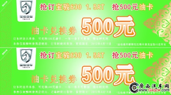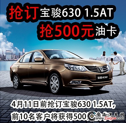 雖然新車還未正式上市,售價還未公布,但已收到不少自動擋車型的訂單。為回饋廣大龍城朋友的厚愛,景茂寶駿開展“搶訂寶駿630 1.5AT 搶500元油卡”活動,在上市價格公布之前訂購寶駿630 1.5AT(自動擋)車型的前10位客戶,可獲得白沙路景茂4S店提供的500元油卡實惠大禮包;顒咏刂箷r間為4月11日21:00