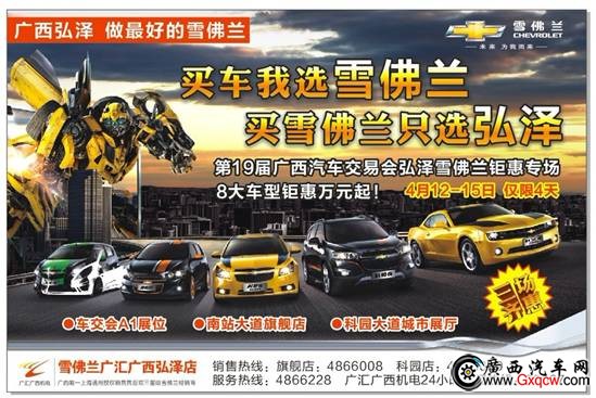 4月12日至15日,雪佛蘭廣匯廣西弘澤店將參加安吉車展,車展期間來到展位詳談均有精美禮品贈(zèng)送,現(xiàn)場(chǎng)更有靚麗車模,更有精美小吃品嘗,誠(chéng)邀您屆時(shí)到展位體驗(yàn)雪佛蘭的購(gòu)車之旅。