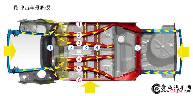 C5車身底板針對正面碰撞設(shè)計了6道加強(qiáng)梁,針對側(cè)面撞擊設(shè)計了5道加強(qiáng)梁,裝備了史無前例的4級潰縮吸能式轉(zhuǎn)向柱。同時采用了矩形貫通式后副車架設(shè)計,作為國內(nèi)強(qiáng)度最大、耐沖擊力最強(qiáng)的副車架結(jié)構(gòu),強(qiáng)有力地保證了乘客的安全。