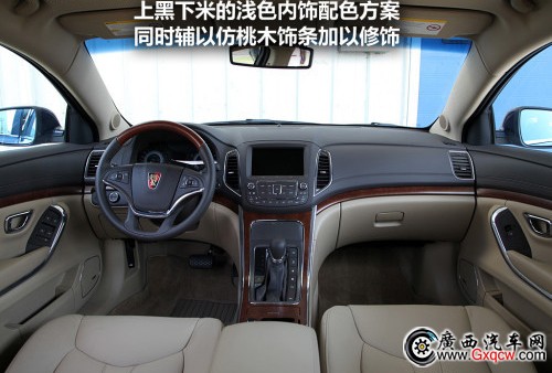 內(nèi)飾方面,出于商務(wù)用車的車型定位,榮威950采用了上黑下米的淺色內(nèi)飾配色方案,同時輔以仿桃木飾條加以修飾,看上去質(zhì)感上佳,不過實際觸感卻不如想象中那么出色,塑料材質(zhì)的應(yīng)用還是讓中控臺的手感略微有些偏硬。