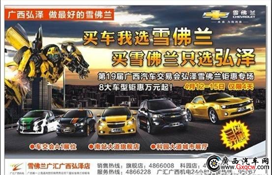 4月12日第19屆廣西汽車交易會(huì)(安吉車展)隆重舉行,在首日的車展中,弘澤雪佛蘭展位上人頭攢動(dòng),熱鬧非凡,“雪佛蘭科邁羅、邁銳寶、科魯茲、愛唯歐、科帕奇,新賽歐全系車型都駕臨車展!”伴隨《變形金剛》一起登陸中國(guó)的“大黃蜂”科邁羅、國(guó)際影星梁朝偉代言的中高級(jí)轎車邁銳寶,榮獲WTCC冠軍的科魯茲、新生代越級(jí)性能小車愛唯歐、家庭理想車新賽歐、以及由搖滾巨星汪峰代言的都市SUV全新科帕奇亮相車展現(xiàn)場(chǎng)。