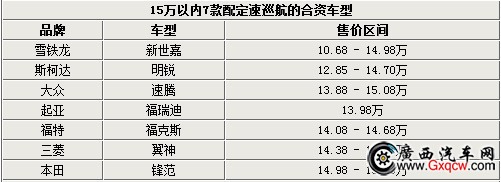 此次我們推薦的這6款配有定速巡航功能的合資車型,其售價均在15萬元左右。其中新近上市的東風(fēng)雪鐵龍新世嘉全系7款車型均配有定速續(xù)航功能,而?怂辜八衮v等5款車型則分別有不同配置搭載了此項(xiàng)功能。