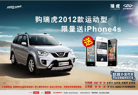 iPhone 4s不再排隊(duì)搶,購瑞虎即可輕松得!即日起至4月30日,各地消費(fèi)者凡購買瑞虎2012款運(yùn)動(dòng)型,即有機(jī)會(huì)獲得限量送出的蘋果iPhone 4s一部,數(shù)量有限,先到先得。