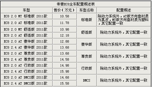 從上表我們看到EC8擁有12個(gè)配置車(chē)型,也可以看出吉利帝豪為消費(fèi)者提供了更多的可選范圍。在這里我是采用同配置車(chē)型進(jìn)行排列。分為標(biāo)準(zhǔn)版、舒適版、豪華版、尊貴版、行政版還有BMCS版。第一行標(biāo)準(zhǔn)版2.0AT采用真皮方向盤(pán),而全系EC8只有2.0MT標(biāo)準(zhǔn)采用軟性塑料方向盤(pán),從這里也能看出2.0MT標(biāo)準(zhǔn)版是EC8最低配車(chē)型,作為一款B級(jí)車(chē)型,僅售10.58萬(wàn)元。