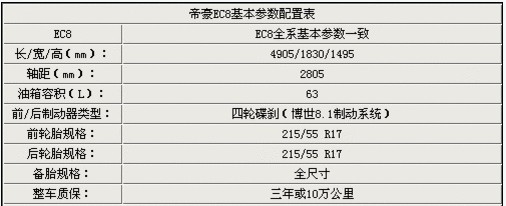 表中我們也看到了,帝豪EC8全系在基本參數(shù)上就連輪胎規(guī)格都是一致的。帝豪EC8車(chē)身尺寸為4905/1830/1495mm,接近5米的車(chē)身,準(zhǔn)確將EC8定位到B級(jí)車(chē)行列,外觀設(shè)計(jì)上氣勢(shì)磅礴,非常大氣。2805mm的軸距也非常出色。