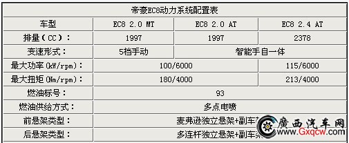 帝豪EC8全系采用三種動(dòng)力配置組合,兩種發(fā)動(dòng)機(jī),兩種變速箱。動(dòng)力配置組合分別有,2.0手動(dòng)檔、2.0手自一體和2.4手自一體。發(fā)動(dòng)機(jī)分為2.0排量與2.4排量。變速箱分為手動(dòng)檔與智能手自一體。