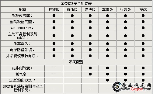 帝豪EC8安全配置方面還是比較豐富,全系標(biāo)配主副駕安全氣囊,豪華版以上車型同時(shí)還配備了側(cè)安全氣囊與側(cè)安全氣簾,在發(fā)生撞擊時(shí)對(duì)乘客的頭部起到很好的保護(hù)作用。車身主動(dòng)控制系統(tǒng)(ABC)全系標(biāo)配,非常給力。還有行政版與BMCS版配置了吉利招牌的BMCS智能胎壓監(jiān)測(cè)系統(tǒng)。定速巡航?jīng)]有全系標(biāo)配,相對(duì)其它自主品牌,這點(diǎn)不夠厚道。