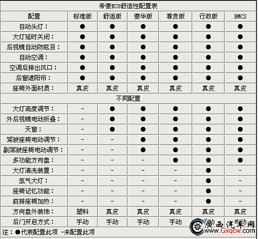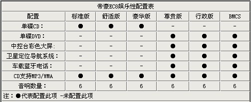 自動(dòng)頭燈、大燈延遲關(guān)閉、自動(dòng)空調(diào)、后排空調(diào)出風(fēng)口、后排遮陽(yáng)簾、這些實(shí)用度很高的配置均已經(jīng)在帝豪EC8上實(shí)現(xiàn)標(biāo)配,大大加強(qiáng)了EC8的競(jìng)爭(zhēng)力。從表中不同配置下面可以看出行政版在舒適性配置上勝出,無愧于行政版的名字,配置相當(dāng)豪華。