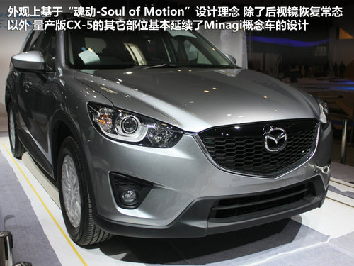 CX-5在外觀上基于“魂動-Soul of Motion”設(shè)計理念,可以看到,除了后視鏡恢復(fù)常態(tài)以外,量產(chǎn)版CX-5的其它部位基本延續(xù)了Minagi概念車的設(shè)計。