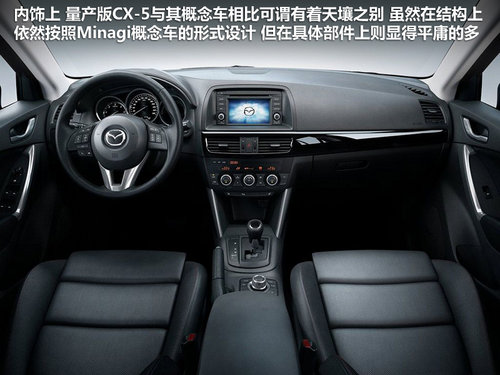車尾的設(shè)計也相對簡潔,雖然并沒有棱角分明的線條,但運用較柔和的曲線依然勾勒出運動的風(fēng)格,給人的整體感覺還是比較圓潤的,或許這樣的設(shè)計更為國人所喜愛。尾部SKYACTIV的標(biāo)識表示CX-5運用馬自達全新的創(chuàng)馳藍天技術(shù)內(nèi)飾上,量產(chǎn)版CX-5與此前廣州車展亮相的概念車可謂有著天壤之別。雖然在大的結(jié)構(gòu)上依然按照Minagi概念車的形式設(shè)計,但在具體部件上則顯得平庸的多。