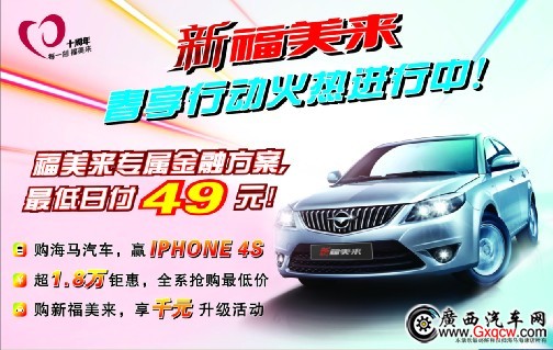 本屆北部灣(南寧)第八屆汽車(chē)展海馬?4S店位于A5展位,即日起到5月6日海馬?4S店推出全系超18000元鉅惠,海馬全系搶購(gòu)底價(jià)最優(yōu)惠活動(dòng)。購(gòu)車(chē)還能贏iphone 4s手機(jī),除此之外購(gòu)福美來(lái)享千元升級(jí)服務(wù),還送萬(wàn)元大禮包。金融方面半價(jià)、0利息,最低日供49元。期間展廳和車(chē)展優(yōu)惠同步進(jìn)行,海馬?,十年信賴。詳詢海馬?凳昀吓频辏咨车辏0771-4922218,五一店:0771-4885118。