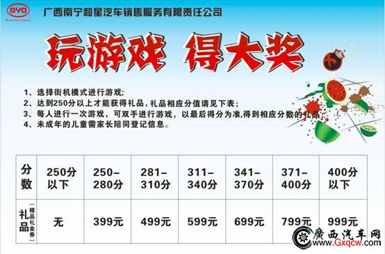4月28日至5月1日,南寧北部灣車展期間,廣西和星比亞迪4S店在B6展區(qū)隆重推出“玩游戲 得大獎”活動,期間我司將會在展區(qū)提供XBOX供廣大朋友們娛樂,讓大家觀展娛樂兩不誤,參與游戲就有機會獲得我們送出的大禮一份,誠邀各位新老朋友光臨。