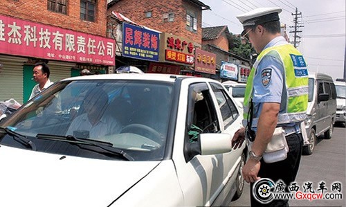 5月2日中午,在南寧市中山路上,交警正在對(duì)逆行車輛進(jìn)行處罰。
