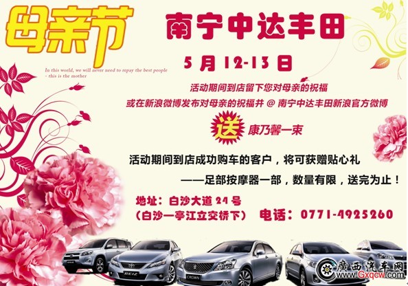 一汽豐田旗下威馳、花冠、卡羅拉、RAV4等車(chē)型無(wú)論在車(chē)內(nèi)空間、節(jié)油、操控性方面均有不俗的表現(xiàn),有興趣的朋友不妨多多關(guān)注。小編近日從白沙大道南寧中達(dá)豐田了解到,5月12-13日將進(jìn)行“母親節(jié)”感恩遇禮:活動(dòng)期間到店留下您對(duì)母親的祝;蛟谛吕宋⒉┌l(fā)布對(duì)母親的祝福并@南寧中達(dá)豐田新浪官方微博即可到店領(lǐng)取溫馨康乃馨一束;活動(dòng)期間到店成功購(gòu)車(chē)的客戶,將可獲贈(zèng)貼心禮足部按摩器一部,數(shù)量有限,送完為止!