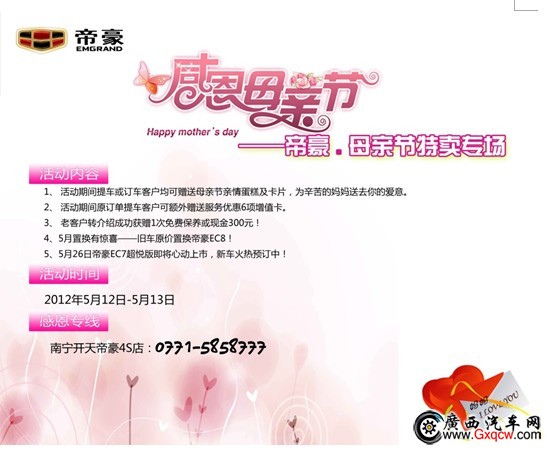 1、 活動(dòng)期間提車或訂車客戶均可贈(zèng)送母親節(jié)親情蛋糕及卡片,為辛苦的媽媽送去你的愛(ài)意。