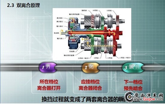 我們以大眾出品的DSG為例,它結(jié)合以上兩種變速器的優(yōu)點(diǎn),沒有使用變矩器,轉(zhuǎn)而采用兩套離合器,通過兩套離合器的相互交替工作,來到達(dá)無間隙換擋的效果。兩組離合器分別控制奇數(shù)擋與偶數(shù)擋,具體說來就是在換擋之前,DSG已經(jīng)預(yù)先將下一擋位齒輪嚙合,在得到換擋指令之后,DSG迅速向發(fā)動(dòng)機(jī)發(fā)出指令,發(fā)動(dòng)機(jī)轉(zhuǎn)速升高,此時(shí)先前嚙合的齒輪迅速結(jié)合,同時(shí)第一組離合器完全放開,完成一次升擋動(dòng)作,后面的動(dòng)作以此類推。