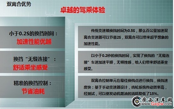 回答:DSG雙離合變速箱具有動(dòng)力傳遞迅速,傳遞效率高的優(yōu)點(diǎn)。08款邁騰搭載的Tiptronic手自一體變速箱由于換擋迅速平穩(wěn)而備受好評,換上DSG雙離合變速箱以后,邁騰的換擋更加平順,在普通路面上行駛,能夠迅速上升到6檔,并且沒有任何換擋沖擊。而DSG比Tiptronic更為明顯的優(yōu)勢在于加速超車時(shí)的隨心而動(dòng)。如果現(xiàn)在您的邁騰在6檔正常行駛,在您的大腦下達(dá)超車指令,油門深踩到底的同時(shí),DSG變速器會(huì)在瞬間由6檔降為2檔,于此同時(shí),強(qiáng)烈的推倍感刺激著你的神經(jīng),更強(qiáng)勁的動(dòng)力瞬間輸出,而一般的變速箱,包括Tiptronic變速箱也只能由6檔將為4檔超車,動(dòng)力的傳遞肯定不如DSG來的迅速、直接。
