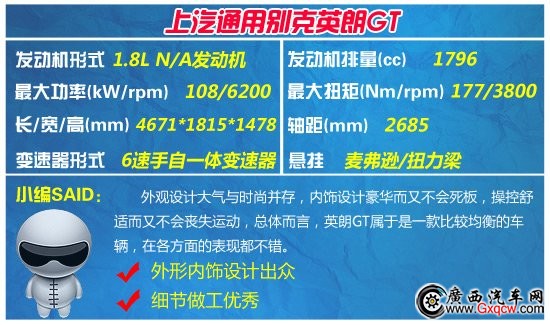 英朗GT的懸掛和動力系統(tǒng)和英朗XT相比沒有什么改變。發(fā)動機是通用的1.8L ECOTEC發(fā)動機,其108Kw的最大功率和177N·m的最大扭矩在1.8L車型中是一個相當(dāng)不錯的數(shù)據(jù),其實際表現(xiàn)應(yīng)該和英朗XT相差無幾。