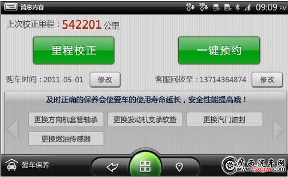 車友互聯愛車保養(yǎng)功能,根據不同車型設定專業(yè)保養(yǎng)計劃,并根據您校正的里程數,GPS終端、網站同步為您提供精準的保養(yǎng)提醒服務;當您收到系統的保養(yǎng)提醒是,可進行保養(yǎng)預約,4S店與您溝通,提前做好保養(yǎng)準備,并且系統會下發(fā)商戶的位置信息,您可直接導航前往,保養(yǎng)愛車更方便。