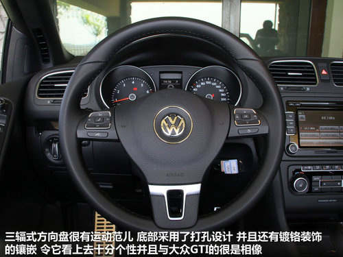 中控臺(tái)與普通版高爾夫并沒有什么太大的區(qū)別,沒有導(dǎo)航的并且不大的液晶顯示器,讓我瞬間找到了我坐的其實(shí)就是高爾夫,這回讓你感到你坐在一臺(tái)高爾夫中,頭頂卻吹著風(fēng),這也許就是高爾夫敞篷的魅力所在吧?照{(diào)旋鈕設(shè)計(jì)為圓形,旋轉(zhuǎn)起來感覺阻尼適中。三檔座椅加熱功能給大眾更多的選擇空間。