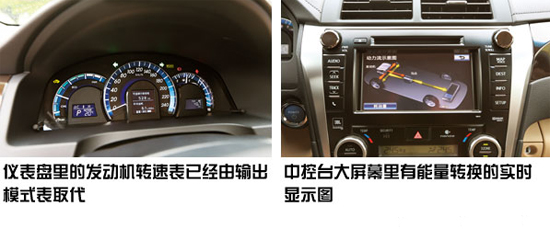 尊瑞的儀表盤里沒(méi)有發(fā)動(dòng)機(jī)轉(zhuǎn)速表,取而代之的是一塊輸出模式表,在“啟動(dòng)”發(fā)動(dòng)機(jī)后車子毫無(wú)聲息,這時(shí)儀表盤里會(huì)有一個(gè)Ready提示符,它表示你已經(jīng)可以給油上路了。中控臺(tái)上還有一處不同,大屏幕里增加了能量轉(zhuǎn)換顯示和綜合油耗表,行駛中電池的電量、充電、放電甚至是一個(gè)時(shí)間段的油耗值都一目了然。