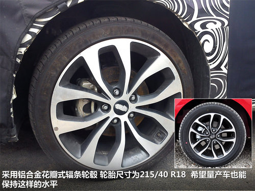 測(cè)試車輪轂上的標(biāo)志被刮掉,但是與起亞秀爾車型的輪轂做一下對(duì)比也不難看出,這是起亞比較新穎的花瓣式輻條輪轂,在國(guó)內(nèi)一些起亞車型上還沒有配備過。輪胎尺寸為215/40 R18,這樣的尺寸在緊湊級(jí)車型中使用也是非常厚道的,但是由于是測(cè)試車,不能肯定量產(chǎn)是否使用相同尺寸的輪胎和輪轂,當(dāng)然我們也希望量產(chǎn)車能有保留。