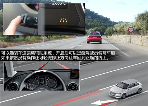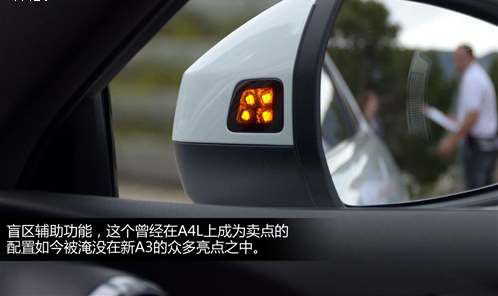 ACC自適應(yīng)巡航系統(tǒng)、盲區(qū)輔助系統(tǒng)、車道偏離提示系統(tǒng)、自動(dòng)泊車系統(tǒng)、全景倒車影響系統(tǒng)。雖然這些功能并不陌生,在很多國(guó)內(nèi)銷售的車型中都有裝配,但集中在一款緊湊型車上還是讓人很有滿足感的。值得一提的是A3還配備了比較少見的膝部氣囊。