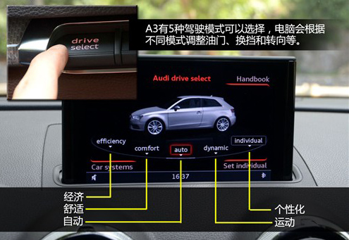 通過MMI系統(tǒng)可以將駕駛模式在舒適、自動(dòng)、運(yùn)動(dòng)、經(jīng)濟(jì)和個(gè)性化五種方案間切換,電腦會(huì)根據(jù)不同模式自動(dòng)調(diào)整油門踏板靈敏度、轉(zhuǎn)向助力的力度,如果是S tronic 7速雙離合變速箱還將調(diào)整換擋時(shí)機(jī)。在經(jīng)濟(jì)模式下,電腦還會(huì)控制空調(diào)系統(tǒng)、ACC自適應(yīng)巡航系統(tǒng)甚至是大燈全部以最經(jīng)濟(jì)的方式運(yùn)行。