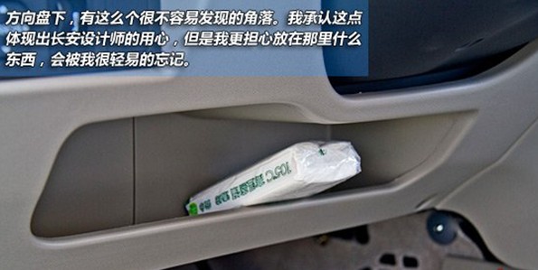 儲物空間方面,前排設(shè)置了很多儲物格,但是大多數(shù)都太淺了,還包括那個(gè)在方向盤下,很不容易發(fā)現(xiàn)的角落。我承認(rèn)這點(diǎn)體現(xiàn)出長安設(shè)計(jì)師的用心,但是我更擔(dān)心放在那里什么東西,會被我很輕易的忘記。不過杯架設(shè)計(jì)很到位,不會像某些同級車那樣,又窄又小,毫無實(shí)用價(jià)值,但是這不包括后排乘客,他們只能公用一個(gè)中央杯架。