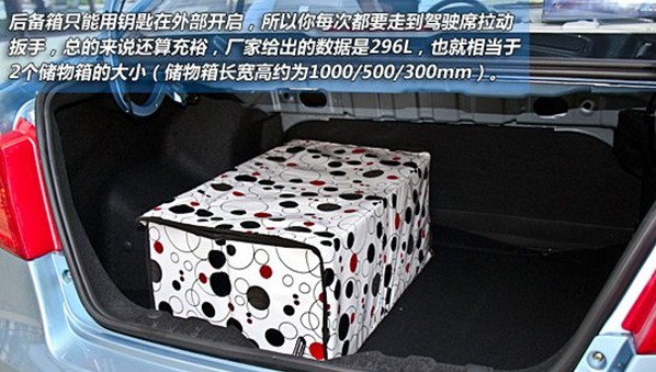 后備箱只能用鑰匙在外部開啟,所以你每次都要走到駕駛席拉動扳手,總的來說還算充裕,廠家給出的數(shù)據(jù)是296L,也就相當(dāng)于2個(gè)儲物箱的大。▋ξ锵溟L寬高約為1000/500/300mm)。后排座椅只能整體式放倒,最大容積可擴(kuò)展到800L,雖然不是太方便,但是用夠用來形容一點(diǎn)也不過分。