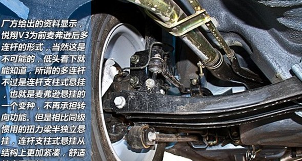 其次是舒適性,這是這款車型必須具備的特質(zhì)。我們可以從懸掛機(jī)構(gòu)上看出一些端倪,廠方給出的資料顯示,悅翔V3為前麥弗遜后多連桿的形式,當(dāng)然這是不可能的,低頭看下就能知道,所謂的多連桿不過是連桿支柱式懸掛,也就是麥弗遜懸掛的一個(gè)變種,不再承擔(dān)轉(zhuǎn)向功能。但是相比同級(jí)慣用的扭力梁半獨(dú)立懸掛,連桿支柱式懸掛從結(jié)構(gòu)上更加緊湊,舒適性表現(xiàn)更好。