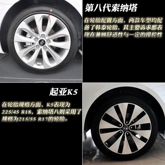 在輪胎配置方面,兩款車(chē)型均配備了韓泰輪胎,其主要訴求都表現(xiàn)在兼顧舒適性與一定的操控性。在輪胎規(guī)格方面,K5表現(xiàn)為225/45 R18,索納塔八則采用了規(guī)格為215/55 R17的輪胎。