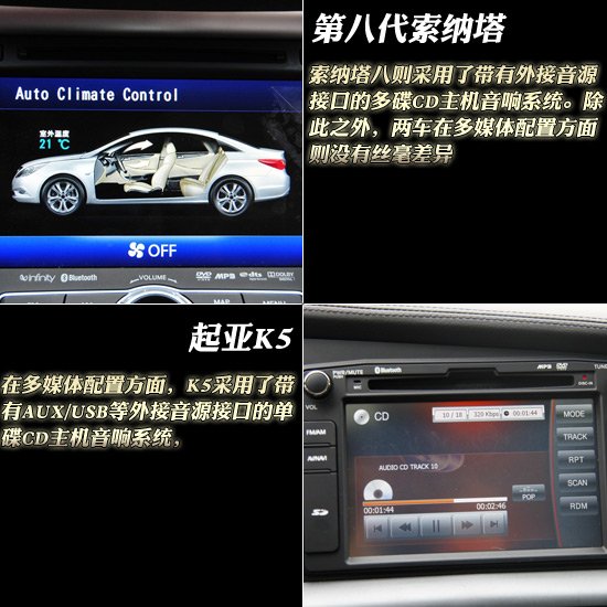 在多媒體配置方面,K5采用了帶有AUX/USB等外接音源接口的單碟CD主機(jī)音響系統(tǒng),而索納塔八則采用了帶有外接音源接口的多碟CD主機(jī)音響系統(tǒng)。除此之外,兩車(chē)在多媒體配置方面則沒(méi)有絲毫差異。